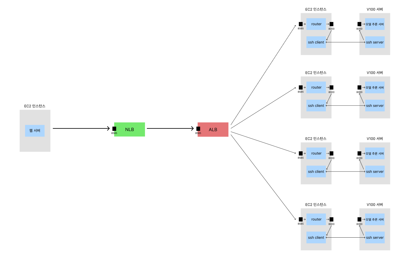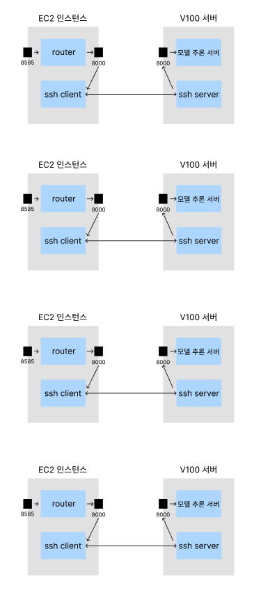 컨테이너로 패키징된 V100 서버가 외부와 통신하기 위해 각각의 V100 서버에 Proxy 서버의 역할을 하는 EC2 인스턴스를 ssh 포트 포워딩으로 연결했다. 이 EC2는 ALB(Application Load Balancer)로부터 넘어온 트래픽을 V100 서버로 전달하는 역할을 할 것이다.