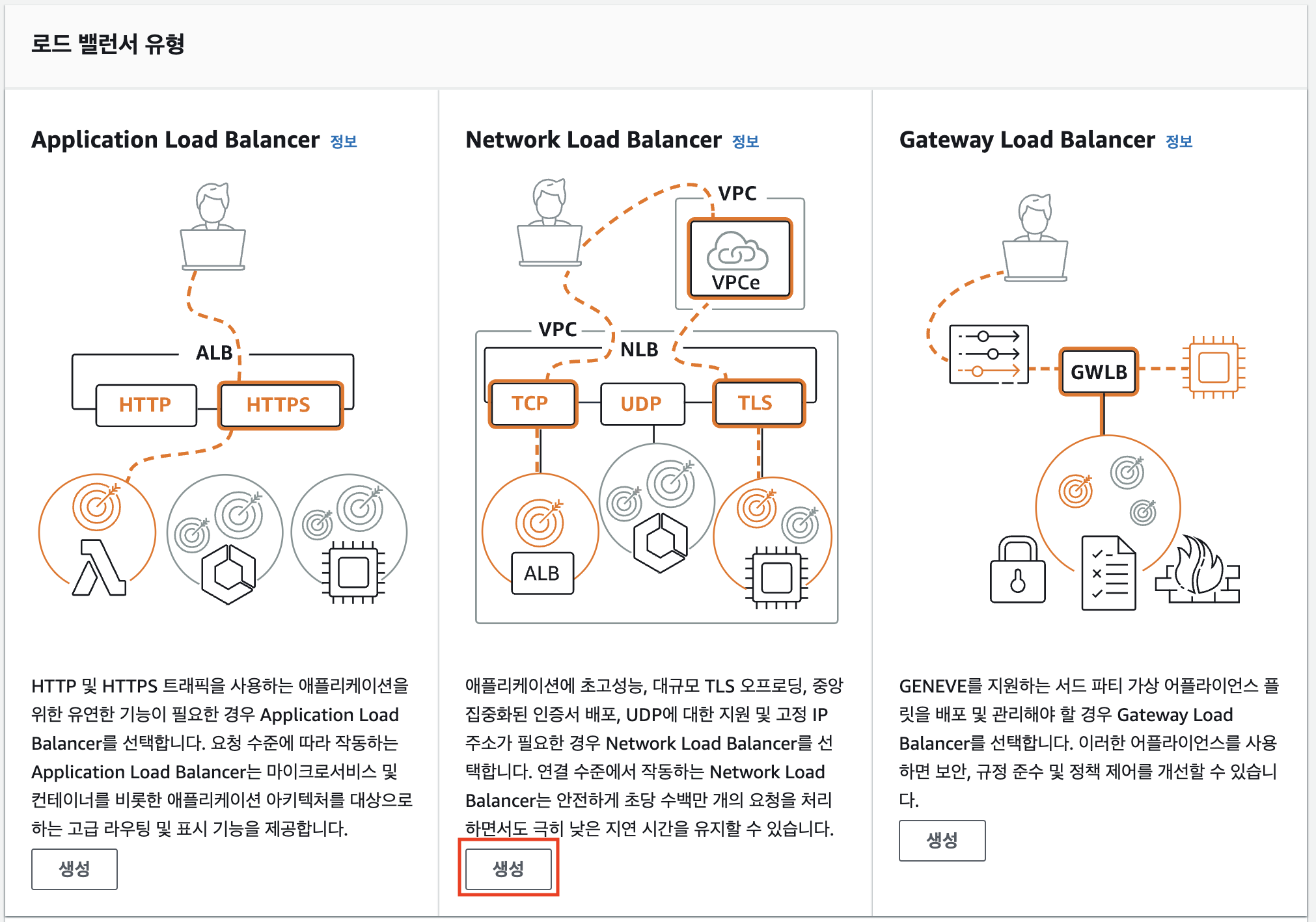 NLB를 생성하는 방법은 ALB와 동일하게 생성하되, 세가지만 주의하면 된다.