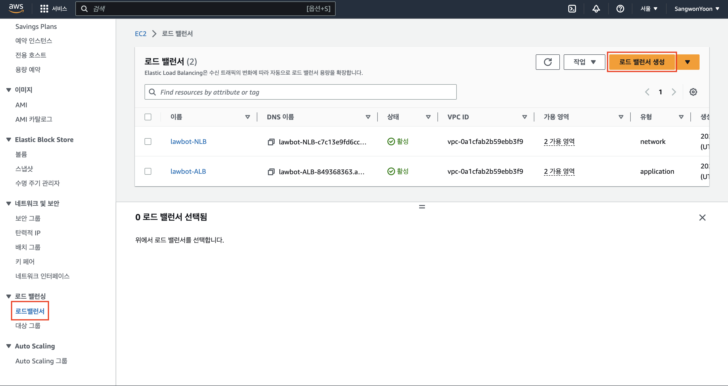 Application Load Balancer를 생성하는 방법은 EC2 서비스에 들어가서 좌측 탭의 로드 밸런서를 클릭 후, 로드 밸런서 생성 버튼을 클릭하면 된다.