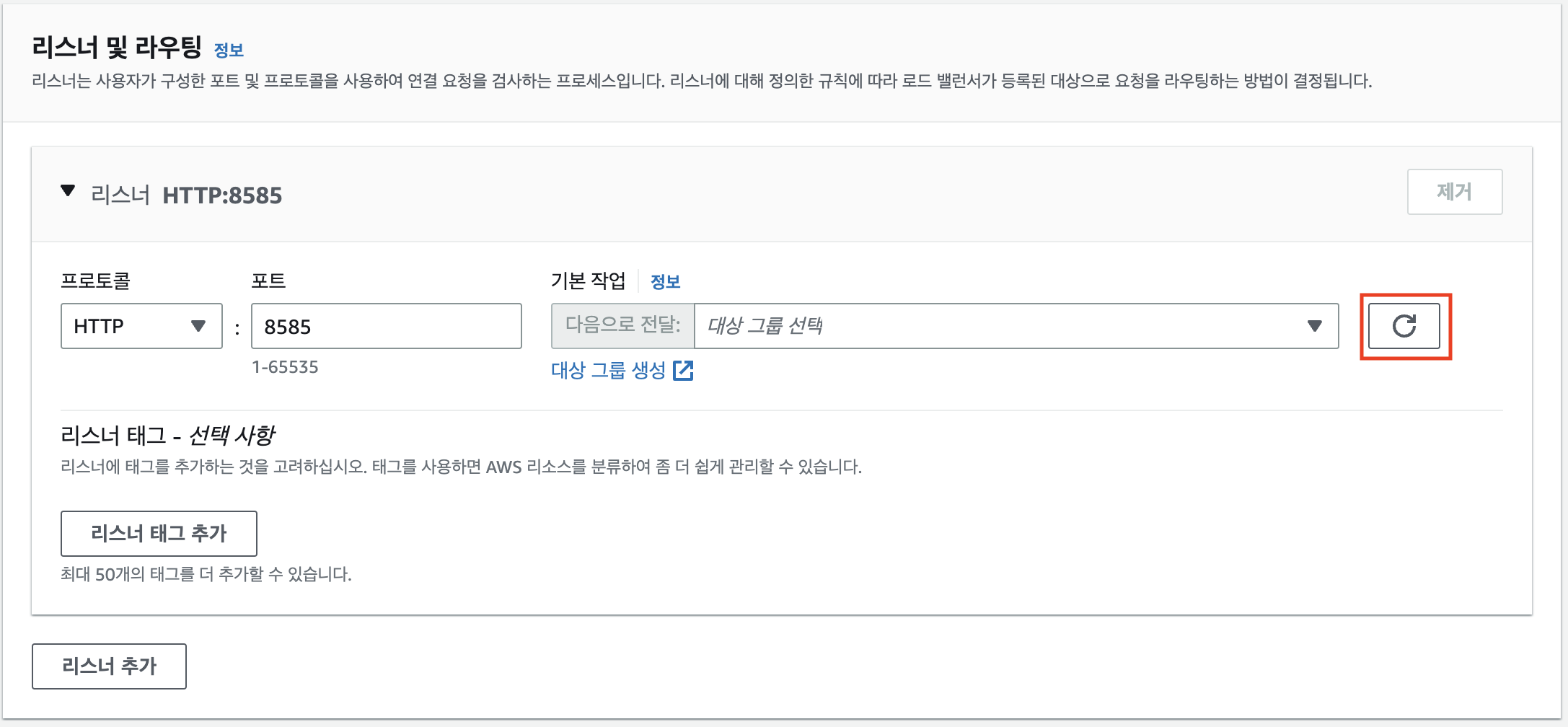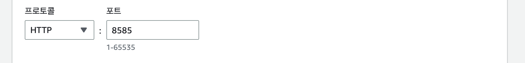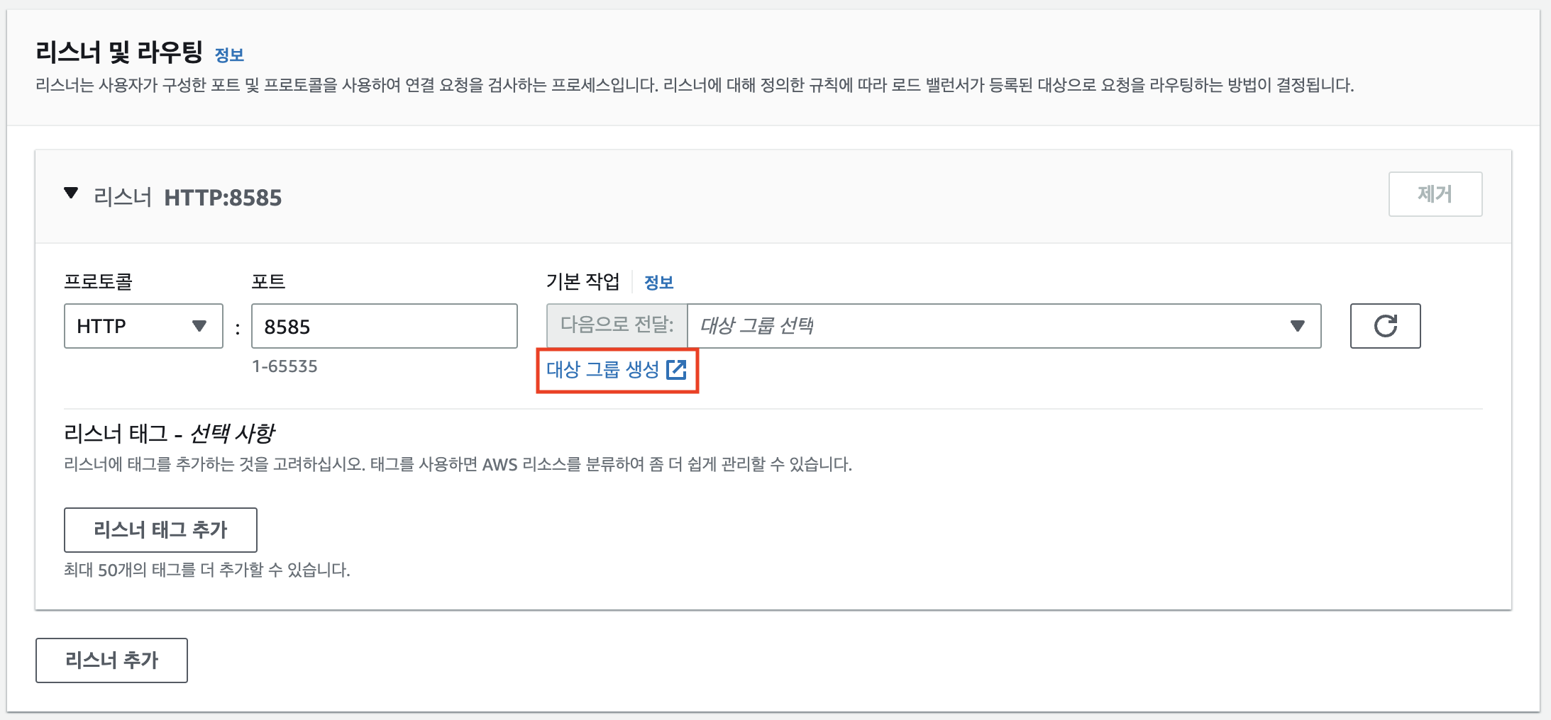 리스너는 로드 밸런서의 입구이고, 대상 그룹은 들어온 트래픽을 전달할 대상이다. ALB의 8585번 포트로 트래픽을 받을 것이기 때문에 HTTP 프로토콜의 8585번 포트를 리스너로 설정하고, 이 트래픽을 전달받을 대상 그룹을 생성하기 위해 대상 그룹 생성 버튼을 클릭한다.