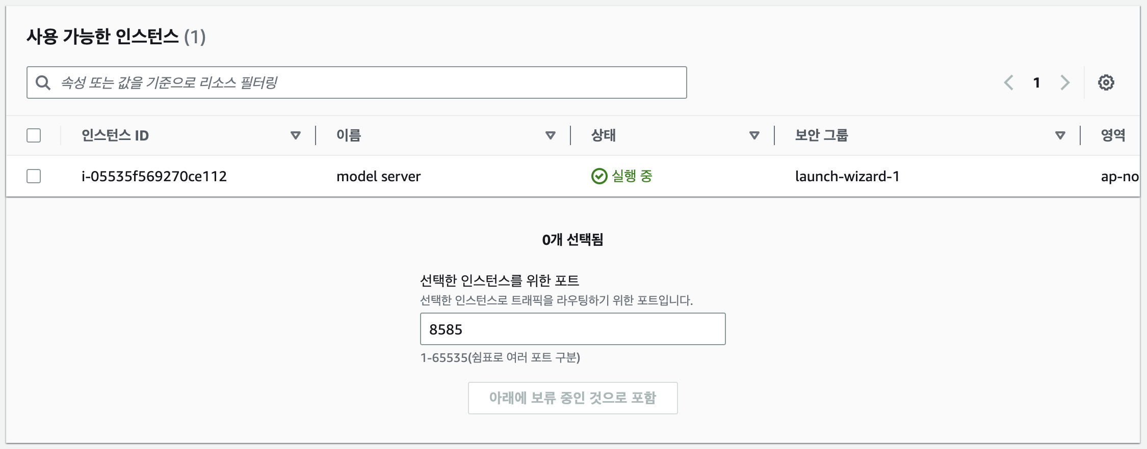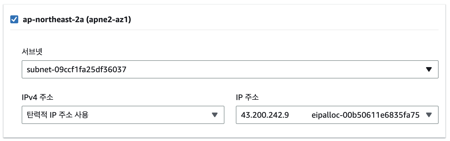 세번째는 NLB에 고정 IP를 등록해야 하기 때문에 네트워크 매핑에서 가용 영역을 선택하는 부분에서 탄력적 IP 주소를 넣어줘야 한다. 탄력적 IP 주소는 EC2 서비스의 좌측 탭에 있는 탄력적 IP에서 할당받을 수 있다. 이제 이 IP 주소가 모델 서버에 요청할 때 사용되는 IP 주소가 된다.