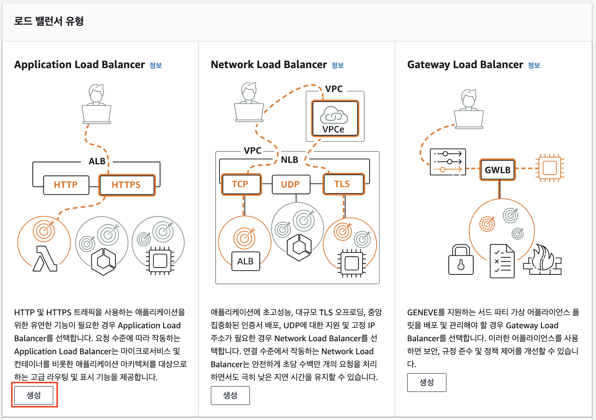 다양한 로드 밸런서의 유형 중 우리는 HTTP 통신 기반의 REST API를 서버에 보내야하기 때문에 Application Load Balancer를 생성한다.