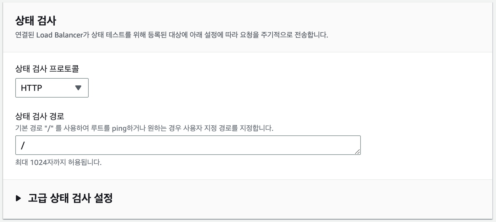 상태 검사는 로드 밸런서와 연결된 대상들이 정상적으로 작동하는지 테스트하기 위해 주기적으로 요청을 보내서 확인하는 시스템이다. 여기서 상태 검사 경로로 요청을 보냈을 때 정상적인 응답이 반환되어야 정상으로 판단하기 때문에 서버에서 간단한 값을 넘겨줄 수 있도록 구현하는 것이 좋다.