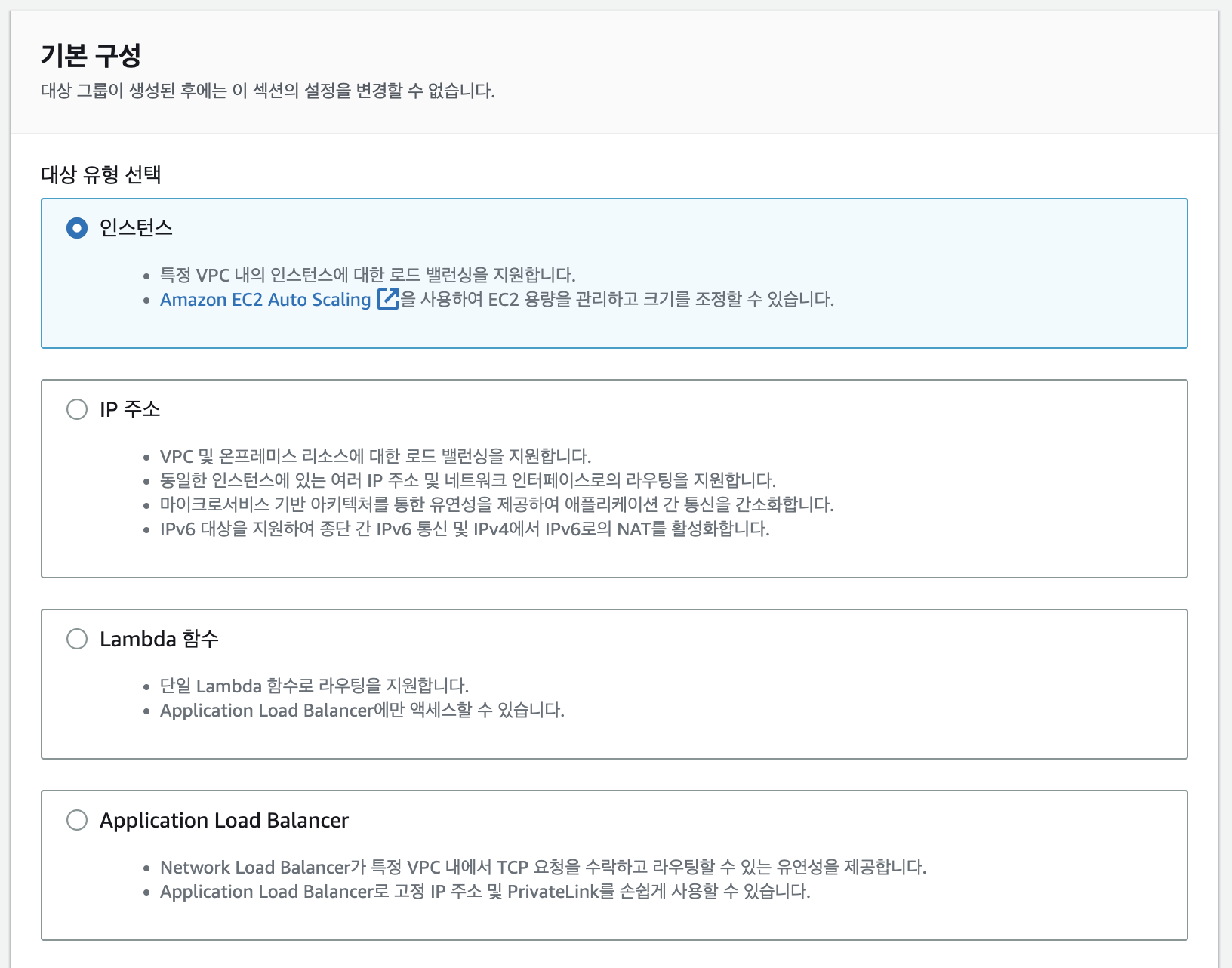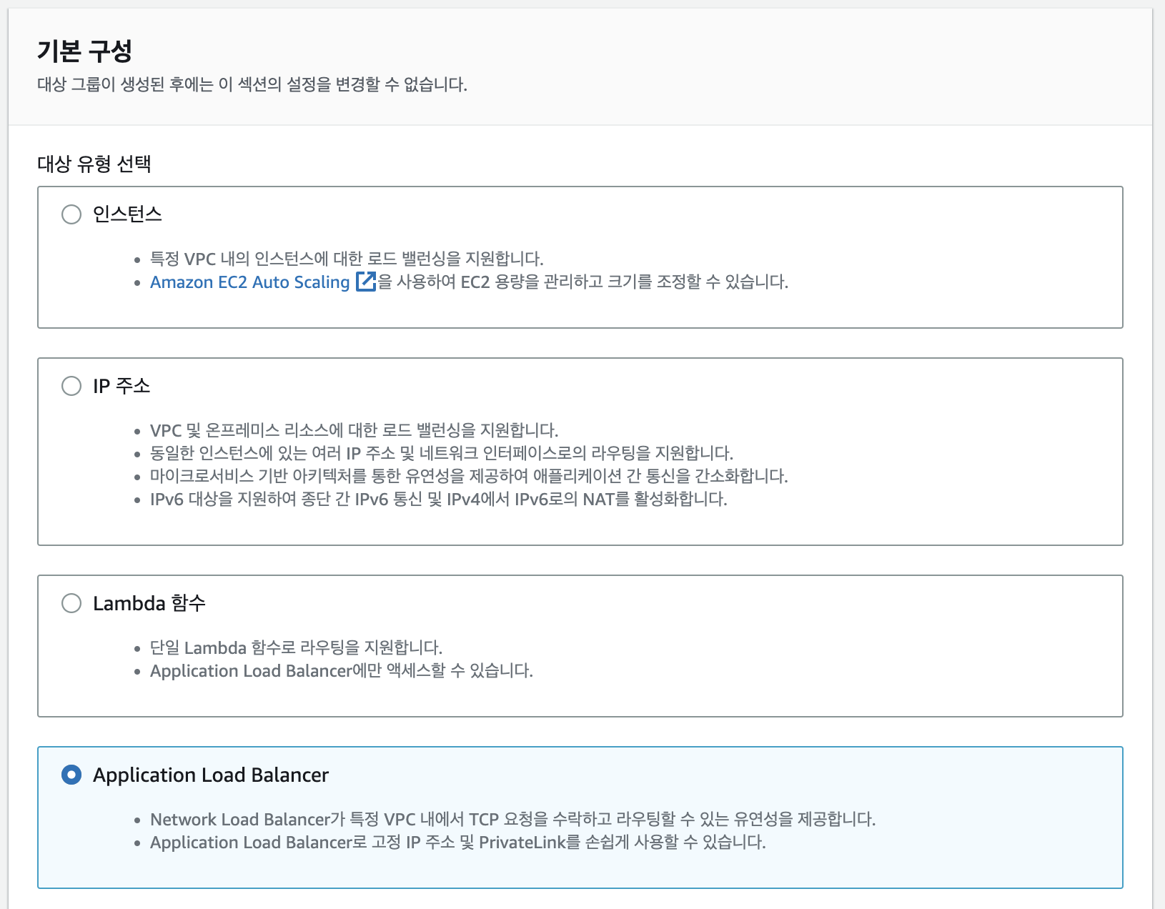두번째는 대상 그룹을 생성할 때 대상 유형을 인스턴스가 아닌, Application Load Balancer로 선택해야 한다.