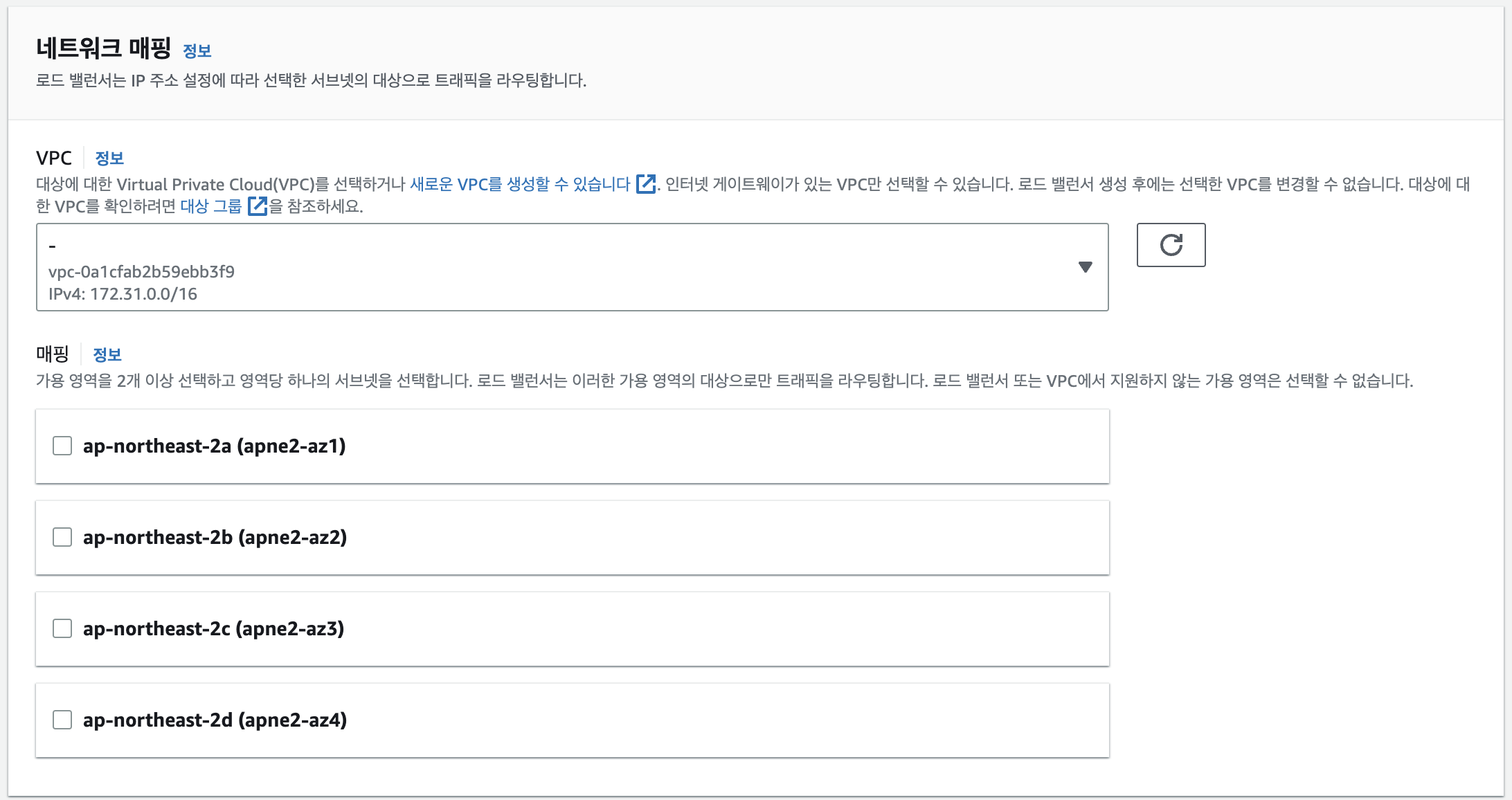네트워크 매핑에서 가용 영역을 2개 이상 선택해야 한다. 여기서 선택한 가용 영역에 존재하는 대상으로 트래픽이 라우팅되기 때문에 앞서 생성한 EC2가 존재하는 ap-northeast-2a와 ap-northeast-2c를 선택했다.